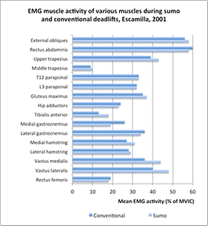 2010 yılında Bret Contreras yaptığı EMG çalışmasında aynı ağırlıkta yapılan Konvensiyonel, Sumo ve Altıgan bar ile yaptığı çalışmada hareket sırasında kasılan kasların ortalama ve tepe noktada kasılma şiddetleri tabloda gösterilmiştir.